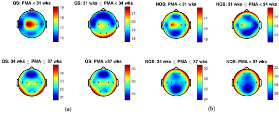 From Figure 4a, it can be seen that the central derivation was dominant below 31 weeks PMA during quiet sleep. In the second age group, from 31 to 34 weeks PMA, the EEG complexity exhibited the highest value in the central and occipital regions. From 34 weeks PMA onwards, the temporal electrodes gained importance as well. Beyond 34 weeks PMA, the spatial maps remained static, with highest EEG complexity in the central, temporal, and occipital regions.