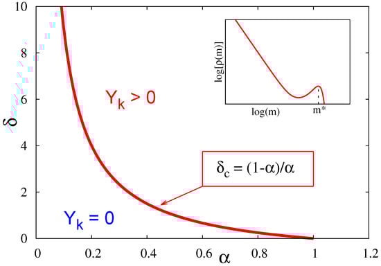 Before proceeding to a detailed characterization of this condensation, let us briefly comment on the value of . For , the total mass in the system scales as , and this scaling precisely corresponds to the typical value of the total mass present in the unconstrained case (see Section 2), as already noticed in []. Hence corresponds to imposing a total mass much smaller than the “natural” unconstrained mass, while for one imposes a mass much larger than the typical unconstrained mass, leading to condensation. In this sense, the situation is similar to that of the extensive mass case for , where condensation occurs when a mass M larger that the unconstrained mass is imposed, . In Figure 2 we present the phase diagram of the model for the case of a constraint to a superextensive total mass, which is a phase diagram in the plane . Two observations are in order for this phase diagram. First, as will be explained in detail in in Section 4.3 and Section 4.4, the presence of a condensed phase never depends on the value of the parameter , apart on the transition line . Second, on the transition line (see Figure 2), the system is in the condensed phase (see Section 4.4), at variance with the behaviour on the critical line for the case of extensive mass (see the phase diagram in Figure 1), in which case the system is not in the condensed phase on the transition line.