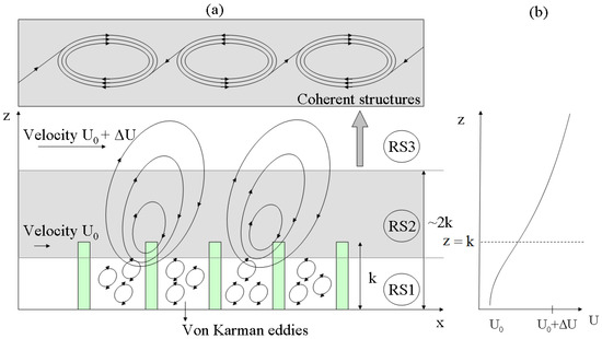 (a) A schematic diagram of the eddies structure over and within the canopy: (i) RS1 zone (; k is the height of the cylinders used for modeling canopies) where the flow field is primarily dominated by small eddies associated with the von Kármán streets; (ii) RS2 zone straddles the top portion of the canopy, and it is dominated by a mixing layer; and (iii) RS3 zone () is the classical boundary-layer region dominated by eddies with length scales proportional to (), where d is the displacement height; (b) the mean velocity profile within the canopy is obtained from the solution of the partial differential equation where: is the velocity at the height k; , are parameters depending on the morphological and aerodynamic characteristics of the canopy and ; is the drag coefficient; is the parameter of proportionality between the turbulent transport coefficient and velocity within the canopy; is the roughness density; and is the shelter factor [22].