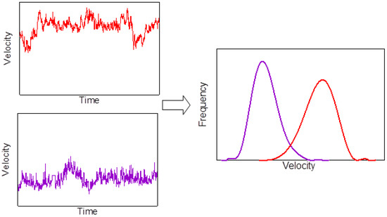 In the treatment of turbulence based on values of turbulence intensity, it is broadly considered as a measure of randomness. However, this definition, which seems reasonable and practical, cannot be used as a complete measure of randomness [8] in the sense as it is defined in [9]. Let us note that Sato et al. [27] proposed a randomness factor defined as the ratio of the energy of the continuous spectrum to the total energy in the power spectrum distribution of the velocity fluctuations [9]. However, there is a problem that the randomness factor takes the same value in the two locations where the flow conditions are different. The goal of this paper is to examine the degree of turbulence in relation to the KC and measures based on that complexity. To explicate that goal, we use Figure 2. The left side of this figure depicts two time series of the velocity measured at two relative heights (see Figure 1) (purple) and (red), respectively, while its right side represents the corresponding distributions of frequencies of velocities that occur in certain intervals. Looking at the distributions of velocities (right panel), we can conclude at which relative height the turbulent motion is more random (red distribution) if we used the measure of randomness based on the values of turbulence intensity. In the further text, we will see that if randomness is evaluated using the KC measure, randomness is greater on the other relative height (purple), which could be in some sense confusing.