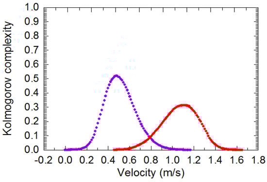 To illustrate the usefulness of the above measures, we consider two time series of the instantaneous velocity measured at (purple) and (red), respectively (see Figure 2). Figure 3 shows that the flow dynamics of turbulence varies with the relative height and the Kolmogorov complexity spectrum’s highest value (KCM). In fact, at (purple curve), the KC is higher than at (red curve). Therefore, we can conclude that at , the turbulence regime is more random, i.e., shows a more pronounced presence of stochastic components than at . In other words, these spectra can effectively point out the dissimilarities between the turbulent regimes for the two different relative heights.