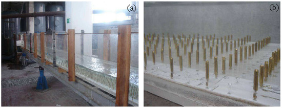 Experimental channel (a) and cylinders as the model of rigid vegetation (b) [40].