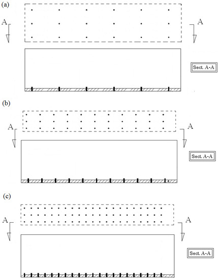 Figure 4 depicts the experimental channel where the experiment measurements were carried out and the cylinders, modeling rigid aquatic plants in the literature on vegetated flows [11,13]. In Figure 5, sets of the cylinders for different densities are represented with the vertical cross section in the A-A direction (see figure).
