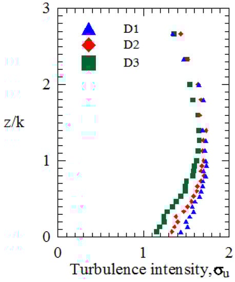The turbulence statistics applied on measured values of velocity quantify how the flow within and just above the canopy behaves as a perturbed mixing layer. Here, the turbulence intensity is expressed as and normalized by the friction velocity , i.e., . The number of the samples in experiments was N = 270,000. Figure 6 shows the measured profiles of for all three densities D1, D2 and D3. From this figure, it is seen that for , turbulence intensity is remarkably damped and is more pronounced for higher . In particular, is in the range from 1.69 (D1), for a sparse canopy, which is typical for rough-wall layers, to about 1.49 (D3), for a dense canopy, which is typical for mixing layers. Those values are close to the ones reported by Jimenez [10].
