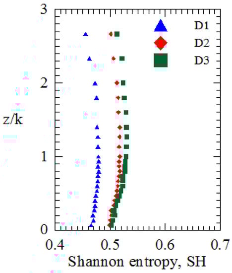 When stable laminar flows evolve toward the turbulence, they become high-order and complex, exhibiting irregular-like motions with organized dissipative arrangements. In order to precisely specify their fields (velocity and displacement), more parameters are required than for the description of laminar flows, i.e., topological measures that quantify the order or disorder of the flow, as the Shannon entropy, which has been already used in the analysis of geophysical fluids [47,48]. The Shannon entropy SH is defined as , where is a discrete probability distribution satisfying the following conditions: ; and [49]. In our calculations, is defined as the probability that the velocity amplitude falls within interval , where was obtained by dividing the entire interval of velocity amplitudes into one million intervals, due to the fact that the precision of the measurements was up to the sixth decimal place. Figure 7 shows that SH is the highest in the mixing layer (), where the turbulence intensity is the highest. However, it decreases towards the free surface. This trend of SH coincides with the conclusions by Wijesekera and Dillion [47]. The decrease of the SH, going to the rough bed, can be addressed to the occurrence of smaller eddies carrying a smaller amount of energy.