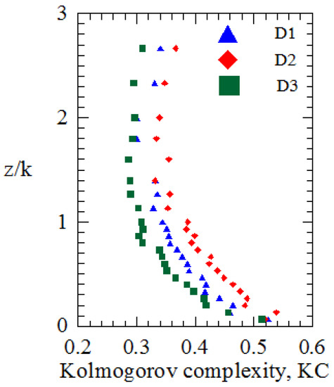 To avoid confusion in the following discussion, we make some comments. Namely, the term complexity in physical systems has the connotation of an explicit measure of the probability of the state of the system. It is a mathematical measure that should not be equalized with entropy in statistical mechanics [39]. Thus, Shannon’s entropy refers to dissimilarities between amplitudes in a time series, while the Kolmogorov complexity refers to the apparent sequence disorder of amplitudes in a time series. This complexity that we intuitively understand as a measure range between uniformity and total randomness (Figure 3 in [39]) is of interest in this paper. Comparing Figure 7 and Figure 8, they seem overall to have quite symmetrical trends. In Figure 7, the SH entropy weakly increases in the RS1 zone; it has a constant value in the RS2 zone and then decreases in the RS3 zone. This trend is clearer for sparse bed roughness elements (D1), but anyway, the density of the bed roughness elements seems to affect SH entropy; in fact, lower SH entropy corresponds to sparse density (D1).