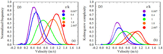 We see that neither use of conventional measure for turbulence in canopy flow, nor the Shannon entropy give us quantitative information about the degree of the randomness. These two measures inform either about the intensity of the turbulence in canopy () or about dissimilarities between amplitudes in a time series. Figure 9a shows the distributions of velocity frequencies for selected relative flow depths, for D3 canopy density (in further analysis, we use only this density for reasons of simplicity, but without losing the generality of the analysis).