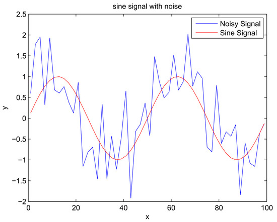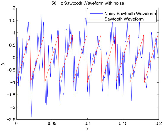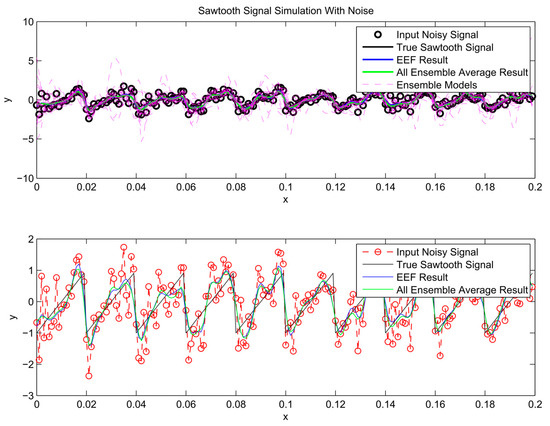 First, random noise with a normal distribution was added to the known sinusoidal, sawtooth, and composite signals (Equations (2)–(4) respectively) to make the noisy signal (Equation (5)) presented in Figure 1, Figure 2 and Figure 3. The noisy signal was used as an input in the bagging procedure to generate an ensemble of input datasets, referred to as ensemble members. Following the steps described in Algorithm 1, the chosen members by the EEF method are used for training ANN’s and subsequently generating the simulation result for each member (Equation (6)).