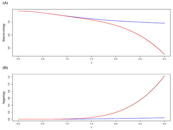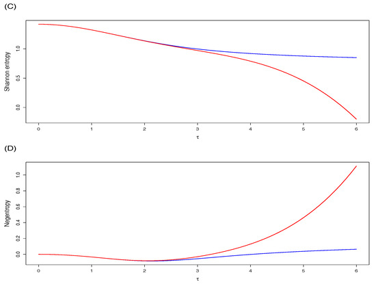 From Figure 1, we observe that the approximations by series expansions are better in the MSN case (Panels C and D) than in the SN case (Panels A and B). Furthermore, that series expansion approximations are quite exact for small to moderate values of the skewness parameter ; more specifically, for in the SN case, and in the MSN case. Additionally, Panels A and C show that the SE decreases as increases, while Panels B and D indicate that the negentropy increases with . Finally, as expected in both GSN models, the SE is less than or equal to the SE of the normal model, namely [6,33].