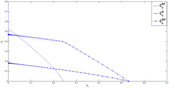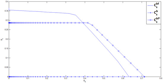 With noiseless feedback, first, we compute Ahlswede and Cai’s achievable secrecy rate region for this binary case. Letting , , , , , using the fact that U is independent of V, and substituting (14) into (4), it is not difficult to calculate Ahlswede and Cai’s achievable secrecy rate region for this binary case, and it is given by