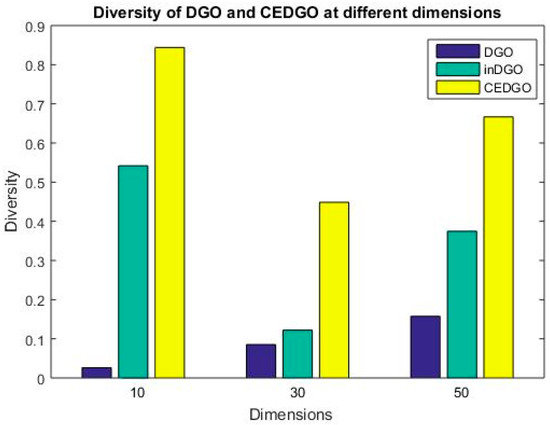 Diversity of DGO and CEDGO at dimension 10, 30, and 50.