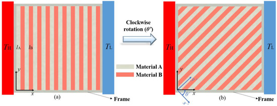 To regulate heat flux vectors in pre-determined paths, the creation of the schematic of the metamaterial tunable cell with conductivity gradients in the function regions should be based on the rotation process described above. Additionally, based on the effective medium theory [11], two kinds of thermal materials with large differences in conductivities are alternately combined to create a field of conductivity gradients. Once the selected materials are combined in parallel and in series under corresponding rotations, the heat flux bends [37,38,39,40,41] following the pre-designed direction. That means that the degree of rotation of the entire system and related material properties directly affect heat flux bending. The thermodynamic properties are also altered by changing variables as confirmed by Equation (13), following the second law of thermodynamics.