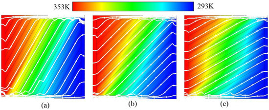 Distributions of temperature fields and related heat flux (white lines) of contrast schemes. (a) Scheme of rotating 30°; (b) Scheme of rotating 45°; (c) Scheme of rotating 60°.