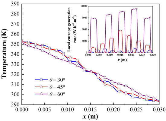 To further investigate the thermodynamic performance in adjacent layers, the temperature distributions in the central lines along the x-direction (y = 0.015 m) shown in Figure 3 were selected. Temperature distributions on the measured lines are shown in Figure 3. It is evident that temperature distributions are more uniform along the x-direction with increasing rotation angles, i.e., deviations in temperatures between adjacent testing points were smaller. The upper right inset illustrates the local entropy generation rates along the central lines. It can be seen that the highest values in a separate scheme were observed in the copper layers, and the local entropy rates in the PDMS layers approached zero. That is, stronger thermodynamic processes occurred in the copper layer because of its higher thermal conductivity. Hence, the distributions of thermal energy in the PDMS layers were far more random than those in the copper layers. In addition, stronger thermodynamic processes occurred with increasing rotation angles as schemes with larger rotation angles were also found to have larger perturbations in local entropy rates. These indicate that thermal energy disturbances were reduced and the thermodynamic process is enhanced by increasing rotation angles. Thus, this latter increase forced a smoother heat transfer, i.e., smaller temperature deviations between adjacent layers along the central lines.