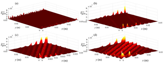 To extend the examination of the local entropy generation rates of metamaterial tunable cells, the distributions of these generation rates are illustrated in Figure 4. The local entropy generation rates of the initial scheme without rotation are also presented to make a rational comparison. As shown in Figure 4a, the distributions of local entropy generation rates in the material layers approached zero, followed a uniform trend, and appeared as “ladders” owing to the conductivity gradients. Moreover, the local entropy generation rates on the inside top and bottom boundaries of the frames were noticeably higher than those in the material layers. That is, the inside top and bottom boundaries of the frames were directly integrated with the material layers, resulting in large differences in entropy generation rates and anisotropies in the conductivities between adjacent boundaries. Hence, the perturbations of thermal energy were more intense at frame boundaries than those in the metamaterial layers. Figure 4b–d present the local entropy generation rates of the other three schemes with rotation angles of 30°, 45°, and 60°, respectively. It can be seen that local entropy generation rates gradually increased with increasing rotation angles, which means that stronger thermodynamic processes occurred with larger rotation angles. Hence, the thermal energy distribution was more orderly. Furthermore, the parallel distance components of heat transfer along the x-direction in both layers increased as a result of increasing rotation angles. Consequently, this directly led to more irreversible heat losses and thermal dissipations in the material layers, which was similarly reflected in the distributions of local entropy generation rates. Moreover, the response of the copper layers to changing rotations was more intense than those in PDMS layers. As such, the varying rotations significantly affected the thermodynamic processes in the material layers with higher conductivities. Conversely, the perturbations of thermal energy were not apparent in materials with lower conductivities. Therefore, more dissipations occurred in the copper layers with increasing rotation angles, which forced the temperatures at the interface of the two material layers to be more similar, as indicated in Figure 3.