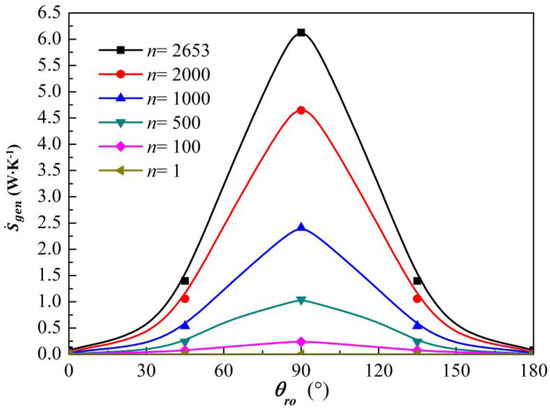 Figure 5 illustrates the variations in total entropy generation rates with the rotation angles (θro) when the ratios of the conductivities were fixed. The figure indicates that the equilibrium total entropy generation rates increased with increasing conductivity ratios. It is seen that with any rotation angle, if n = 1, the equilibrium total entropy generation rates were zero, which indicate that there was no conductivity gradient and the system was homogeneous. Hence, no effects on bending heat flux could be observed. The symmetry of the rotation process also affected the values centered on θro = 90°. The values first increased and then declined as soon as the conductivity ratio was fixed. Moreover, the values varied nonlinearly in the ranges of 0°–90° and 90°–180°. Before θro approached 30°, the rate of change (slope) of the rotation angles gradually increased with increasing clockwise rotation angles. However, with θro in the range of 30°–90°, the slope rapidly increased. The varying trends when θro was within the range of 90°–180° were different from those when θro was within the range of 0°–90°, owing to symmetry. That is, thermal dissipations and system irreversibility increased with increasing rotation angles in the range of 0°–90°, owing to the increasing parallel distance component, which resulted in more irreversible heat loss. Moreover, the minimum values were obtained at θro = 0° and θro = 180°, when the system was without rotation. However, they are not zero, owing to the anisotropy in the system composed of two materials.