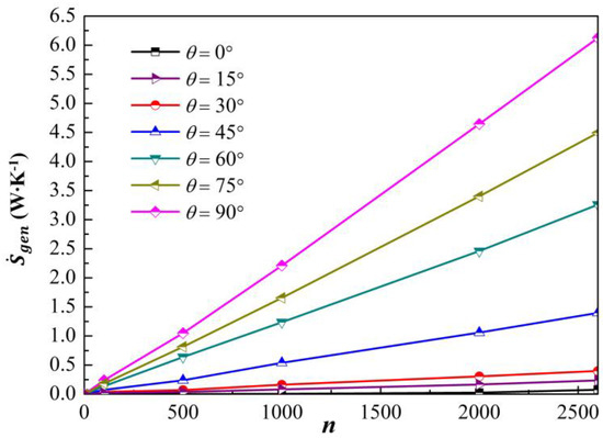 - The total entropy generation rates of the entire system have been investigated. The values increased linearly with the increasing conductivity ratios. In addition, the highest values occurred when θro = 90°, i.e., the arrangement of materials was parallel to the x-direction; the minimum value occurred when θro = 0°, i.e., the schemes were without rotations.