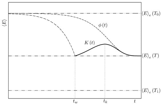 We look into the Kovacs experiment in a more detailed way in Figure 1. In recent studies of the effect in glassy systems, the relevant physical variable is the energy instead of the volume [,,,,,,]. The system is equilibrated at a “high” temperature , and at , the temperature is suddenly quenched to a lower temperature T, after which the relaxation function of the energy E is recorded. Specifically, , where is the average equilibrium energy at temperature T. Then, a similar procedure is followed, equilibrating the system again at , but at , the temperature is changed to an even lower value , . The system relaxes isothermally at for a certain time , such that equals . At this time , the temperature is increased to T, but the energy does not remain constant: it displays the behavior that is qualitatively shown by . At first, increases from zero until a maximum is attained for , and only afterwards, it goes back to zero. Similarly to the relaxation function, we have defined , for . Note that for all times, with the equality being only asymptotically approached in the long time limit.