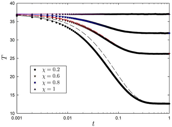 (Color online) Direct relaxation of the granular temperature T for different final noise amplitudes. All curves start from the stationary state corresponding to . We compare Monte Carlo simulation results for a system of sites (symbols) with the numerical solution of the first Sonine approximation, Equation (38) (solid lines), and the analytic solution of the linear response system, Equation (44) (dashed lines).