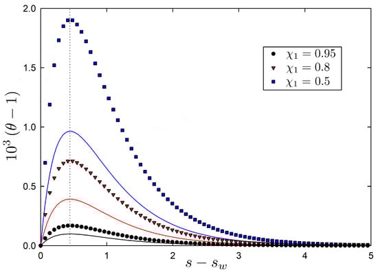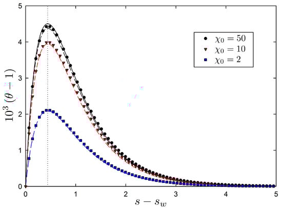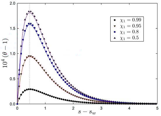 In Figure 5, we put forward a comparison between the Kovacs hump obtained from the numerical solution of the first Sonine approximation equations and our theoretical expression for the nonlinear regime, Equation (52). Fixing and , as increases (as the waiting time is increased), the hump approaches Equation (52) with . Moreover, our theory perfectly reproduces all the numerical curves when we substitute the actual values of into Equation (52).