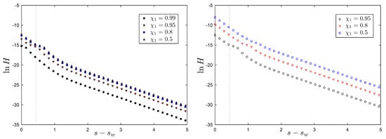 There is strong numerical evidence about being a Lyapunov functional for granular fluids, thus allowing it to be considered as an out-of-equilibrium entropy relative to that of the NESS, in this context [,]. Moreover, it has been analytically proven that is a Lyapunov functional in our system for the Maxwell collision rule [].