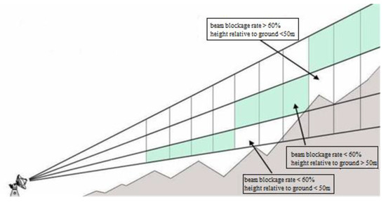 Schematic diagram of radar echoes with elevation (Zhang, 2006). When the beam blockage of a pulse volume’s echo factor exceeds 60%, or if the central point of a pulse volume is less than 50 m above ground, its data is then replaced by the echo factor of the next (higher) elevation angle.