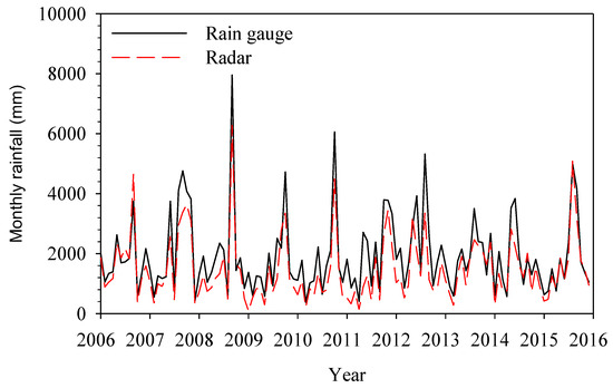 The monthly rainfall in the Feitsui Reservoir’s catchment from 2006 to 2015.