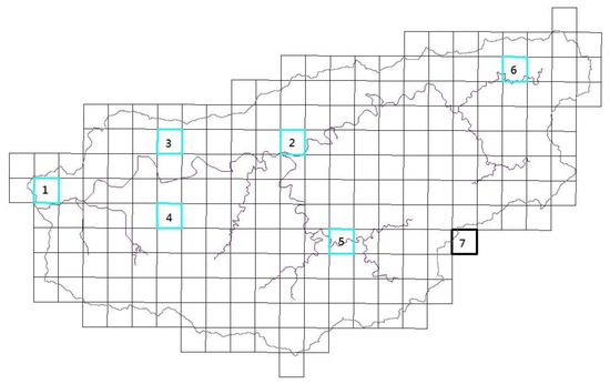 The grids labeled 1–6 in Figure 7 correspond to the locations of the six currently existing rain gauge stations in the catchment. The entropy value of these six stations is already ~94%, which indicates that these stations are sufficient for normal operation of the water reservoir. Nonetheless, if an improvement in the completeness of the data is desired, the addition of a station at Grid 7 will increase km from 0.938 to 0.958, which is larger than the = 0.95 threshold. Therefore, we propose that one more rain gauge station should be added to the study area, in addition to the pre-existing rain gauge stations. The location of this station is indicated by Grid 7 in Figure 7, and it is located at the boundary of the catchment in the southeastern part of the study area.