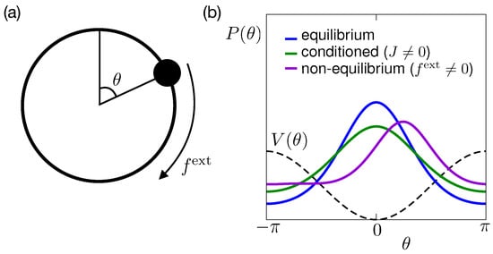(a) Illustration of the example system described in Section 3.2. A particle moves on a circle, with co-ordinate . There is a conservative force and (possibly) an external force that drives the system around the circle. (b) Sketches showing the expected behaviour of the (marginal) probability density function of the angle in different states (see Section 3.7, also [] (Figure 4)). The form of the potential is shown as a dashed line. At equilibrium () one has . For , the distribution favours positive , so that the average of the gradient force can balance the external force , in the steady state. For conditioned ensembles with positive current, Symmetry (27) requires that remains symmetric under , see Equation (35). However, to support the finite current J, the distribution of the momentum must have a distribution that favours (not shown).