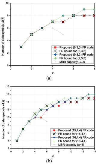 Figure 2 demonstrates the number of data symbols of the proposed FR codes with parameters , , , , and . We cannot find any existing FR code whose parameters are the same as the proposed ones, and thus, we plot the MBR capacity and the FR capacity bound in (3). We can see that the and FR codes are optimal because they achieve the FR capacity bound for all k. The , , and FR codes do not exactly achieve the FR capacity bound, but the gaps become smaller; thus, it deserves to be called FR capacity-approaching.