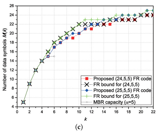 Comparison of the number of data symbols to be stored in the proposed fractional repetition (FR) codes with the minimum bandwidth regenerating (MBR) capacity and the FR capacity bound. (a) and FR codes; (b) and FR codes; (c) and FR codes.