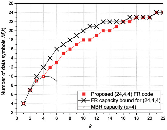 The number of data symbols of the FR code in Example 9 is presented with respect to k in Figure 3. Note that in this example, we can obtain another FR code with the same code length of 24 given in Figure 2c. However, they have different and such as and , respectively. Note that there is some deviation between the upper bound in (3) and of the proposed one in Figure 3. Remember that since (3) is the upper bound, there is no guarantee that the bound is the same as the actual capacity of FR codes. However, for the low k’s, which are less than or , we can see that the proposed FR code can achieve the capacity as in Figure 2a–c and Figure 3.