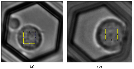Normal lymphocyte (a) and Jurkat cell (b) in the PW matrix. At about the center of each cell, 50 × 50 pixel ROIs (5.5 µm wide) are marked.