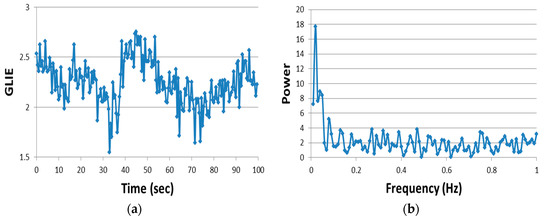 Live cell time-dependent GLIE25 of one typical measurement unit and its Fourier analysis. Images were acquired at 0.5 s intervals out of which GLIE25 values were calculated (a), and its power spectrum was analyzed (b).