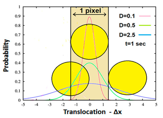 The practical meaning of the above is that the Probability Distribution Function (PDF) of translocations of the diffused particle obeys normal distribution, which has a variance of Figure 3 further illustrates this explanation. It depicts a microscopic partially transparent intracellular element such as an intracellular organelle or vesicle (yellow circle) located between a light source and a single light detector (pixel). Based on the above section, this element conducts “thermic-like” diffusion, upon which the distribution of its translocations around the origin (0,0) should obey one-dimensional Gaussian distribution. Possible distributions which may have different D (diffusivity) values are depicted in the figure by different colors (see inset). Now, for the sake of simplicity, let’s assume an element with the same size of the pixel via which it is detected. Hence, due to its partial transparency, the amount of light detected by the pixel will depend on the position of the element in relation to the detecting area. Three representative situations are illustrated in Figure 3. In the first, the element maximally prevents light from reaching the pixel (center) i.e., yielding the lowest detected gray value. In the second, the element is pushed/diffused to the right, where it doesn’t cover the pixel at all, a case where maximum light reaches the detector, yielding maximum gray value. In the third, the result of the element diffusion to the left, where it only partially covers the pixel detecting area, yields intermediate gray value. Obviously, the outcome of the pixel gray values and their SD must follow the behavior of the random time-dependent translocation of the element diffusing above the pixel.
