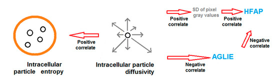 In summary, theoretical analysis indicates that the thermodynamic generalized entropy of Intracellular particles is closely related to their diffusivity. The latter is (a) negatively correlated to AGLIE values probably due to decreased compartmentation and increased intracellular medium homogeneity and (b) positively correlated to the SD of image pixel gray values and HFAP values (the positive correlation between diffusivity and HFAP values is mainly due to the logarithm-based negative correlation between AGLIE and HFAP values).