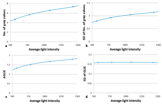 The dependency of number of gray values, AGLIE and derived fluctuate measures on light intensity. The parameters that were measured in different light intensities in the 5 × 5 pixel measurement units of the 6 measured areas were: (a) Average number of gray values, (b) the SD of the number of gray values in the time dependent 200 measurements, (c) the average GLIE values and (d) the SD of GLIE values in the time dependent 200 measurements. Points are connected by a curve in order to emphasize the trend of the results. Coefficient of variation never exceeded 1%.