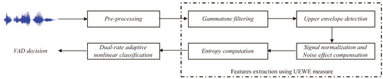 In this proposed VAD, the UEWE measure is used to extract robust discriminative features of the signal, while DANF is used to compute an adaptive threshold at the dual-changing rate. The various techniques used for feature extraction and the classification procedures of speech and non-speech segments are discussed below.