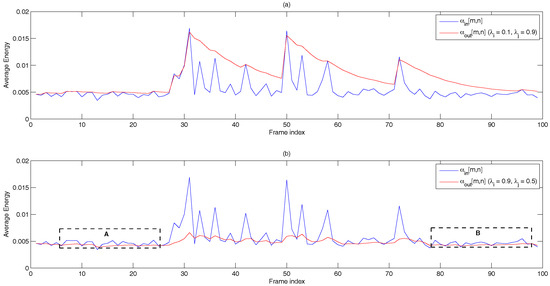 where m is the frame index, n is the channel index and and are constants. By having two conditional filter designs, the asymmetric nonlinear filter is able to track the fast-changing speech energy or the slower time-varying noise floor depending on the value of and from Equation (4). When < , the nonlinear filter is tuned to track the upper envelope of the fast-changing speech energy. When , the filter tracks the slower-varying noise floor or the lower envelope. Figure 2 illustrates the two modes of tuning of the asymmetric nonlinear filter.