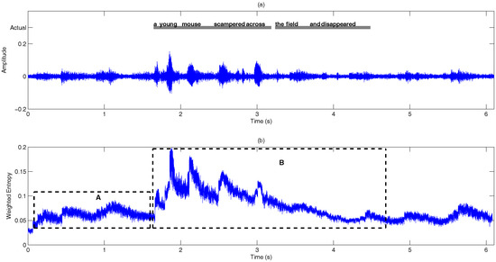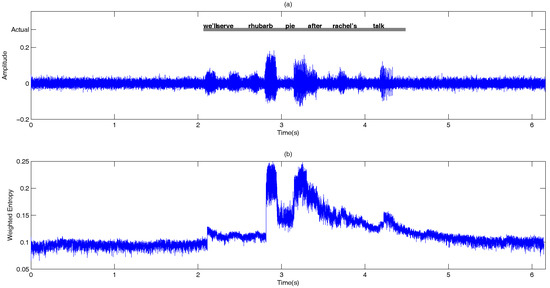Figure 9. (a) Speech signal degraded by crowd noise at 0 dB SNR; (b) weighted entropy . - Step 7