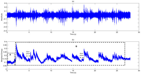 Illustration of a signal of multiple sentences and the weighted entropy extracted using the UEWE measure: (a) an audio sample consisting of a multiple utterances and crowd noise at 0 dB SNR; (b) corresponding weighted entropy feature for the signal described in (a).