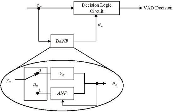 The decision threshold for Region A is set to the input, , while the decision threshold for Region B is computed using the asymmetric nonlinear filter (ANF). A simple binary switch controller, , with two states, i.e., off (zero) and on (one), is used to determine the switching between Region A and Region B, respectively. The controller is turned on when is higher than the transition threshold, . The ANF is used as a lower envelope detector to aptly separate speech segments and short intermediate pauses (if any) in Region B into speech and non-speech classes, respectively. The filter output, which is the decision threshold of the current m-th frame, is fed back to the ANF for the next filter cycle. The output of the DANF () is fed into the decision logic circuit to produce the final VAD decision.
