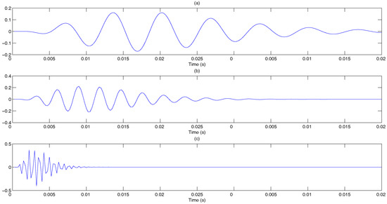 Figure 6. Impulse response of gammatone filter bank: (a) gammatone impulse response at Hz; (b) gammatone impulse response at Hz; (c) gammatone impulse response at Hz.