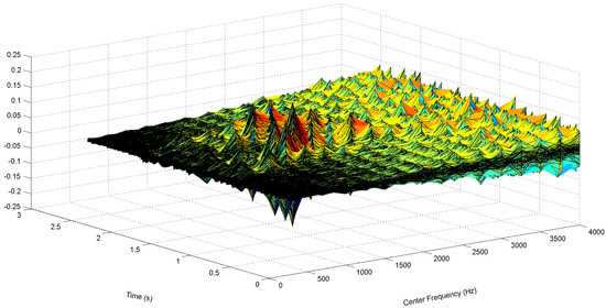 - Gammatone filtering: A K channel gammatone filter bank, where each filter has length L, is constructed based on Equations (1)–(3). The impulse response of the k-th gammatone filter is denoted as , where , with center frequency , where the frequencies , …, , …, are equally distributed on the ERB-rate scale to cover the useful speech spectral bands. Figure 6 shows the plots of the gammatone impulse response at three different center frequencies. The pre-emphasized signal is then passed through each gammatone filter, and the output is denoted as:and illustrated in Figure 7.