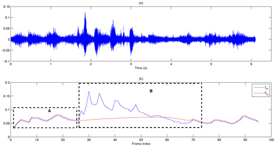 - Dual-rate adaptive nonlinear filter: The input of the filter is the frame averaged entropy, i.e.,A controller, , is used to differentiate the long noise interval (Region A) and potential speech segments (Region B). We set = 0 and in the starting frame. In subsequent frames, and are given by:where is the transition threshold to set from zero (Region A) to one (Region B), where and are the mean and standard deviation of the eight most recent values of of only the noise frame. Figure 10 demonstrates the adaptivity of the decision threshold of a noisy signal. In Region B, when , the decision threshold, computed using ANF, varies slowly with respect to the DANF input, whereas in Region A, the decision threshold adapts itself to the fluctuating noise floor.