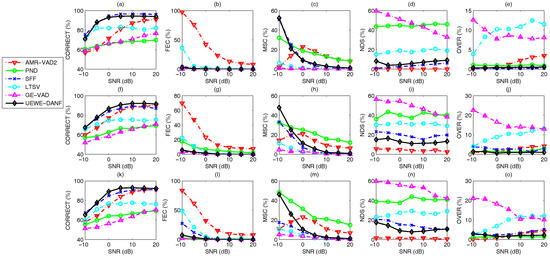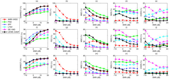 Performance comparison as a percentage of detection accuracy/CORRECT, front-end clipping (FEC), mid-speech clipping (MSC), noise detected as speech (NDS) and carry over (OVER) for different noise types at various SNR: (a–e) street noise; (f–j) subway noise; (k–o) train noise.
