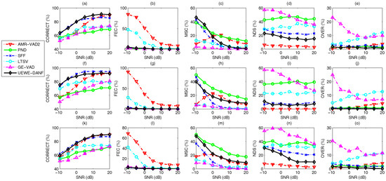 Performance comparison as a percentage of detection accuracy/CORRECT, front-end clipping (FEC), mid-speech clipping (MSC), noise detected as speech (NDS) and carry over (OVER) for different noise types at various SNR: (a–e) AWGN; (f–j) airport noise; (k–o) babble noise.