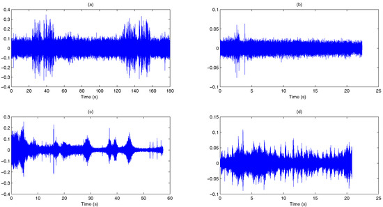 Noise signals form the AURORA-2 database. (a) Airport noise; (b) car noise; (c) street noise; (d) subway noise.