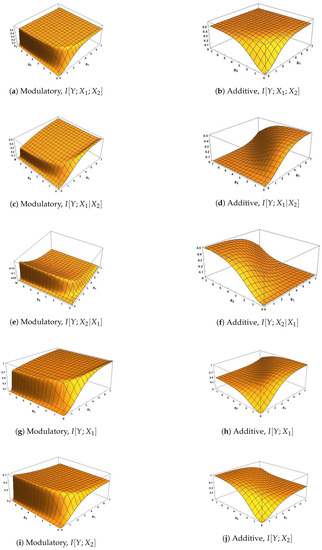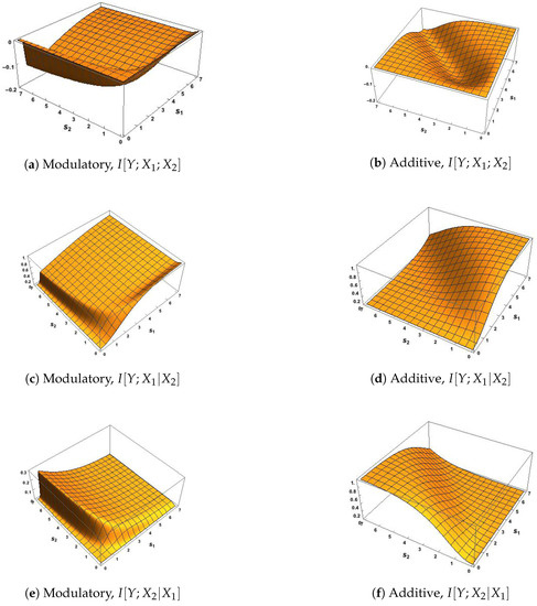 In Figure 3a,b, the surfaces of the co-information are negative, as expected from (8), since the correlation between and is zero and so their mutual information is zero.