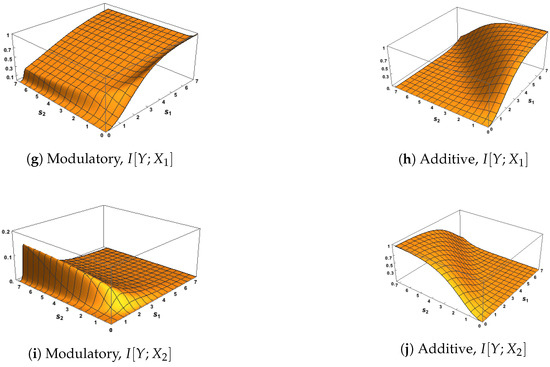Since we are particularly interested in interactions among the three variables, we now show the classic Shannon information measures defined in (6)–(9), with surface plots given in Figure 2 and Figure 3. A correlation between the inputs of was considered to ensure that these measures have the same maximum possible value of bits, and a zero correlation was considered to represent the case of independent inputs. One purpose is to discuss the general links between requirements 1–4 and conditions M1–M3 from Section 3 and also the use of the transfer functions defined in (10) and (12).